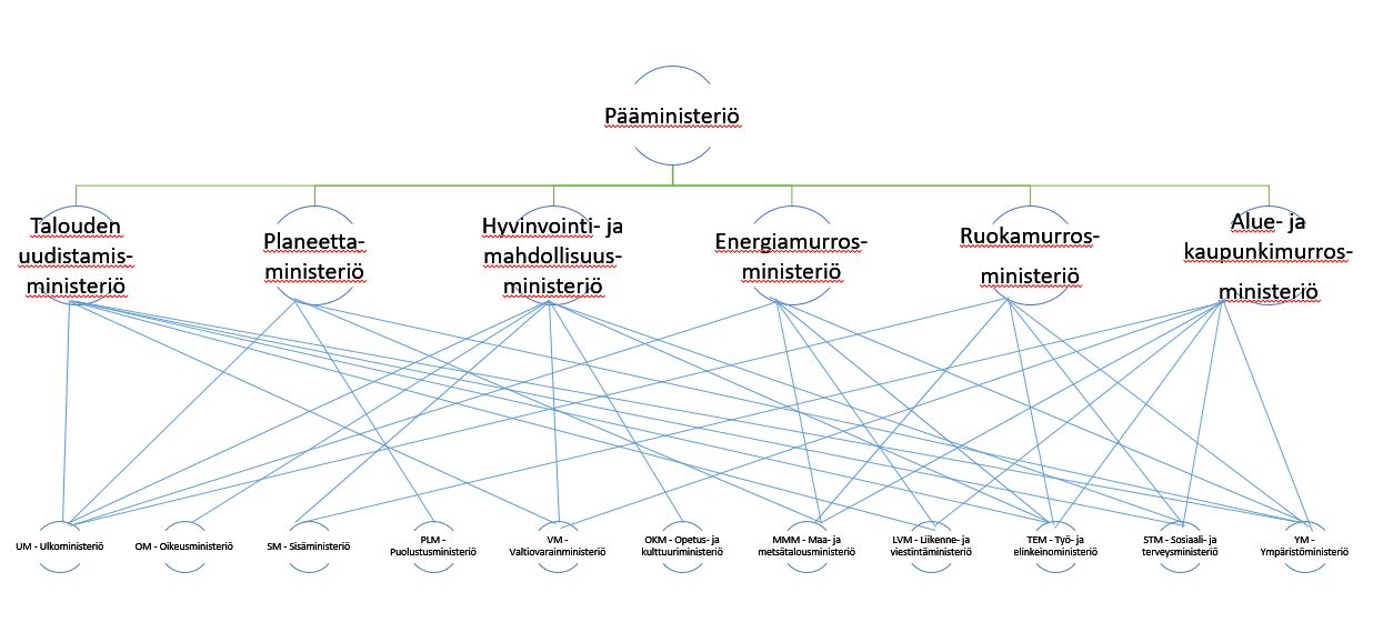 Kuvittelemassamme tulevaisuudessa, jossa poliittiset tai hallinnolliset esteet eivät asiaan vaikuttaisi, kestävyysmurrosta toteuttava ministeriörakenne sisältää nykyisten 12 ministeriön sijaan kuusi kestävyysmurrosministeriötä sekä niiden yläpuolella lainsäädännön johdonmukaista toteutusta koordinoivan pääministeriön. Pääministeriö auttaa ratkaisemaan ministeriöiden välille nousevat vaikeat ristiriidat siten, ettei mikään systeemimuutos nouse hallitsemaan liiaksi muita, vaan murroksen toteuttaminen on aidosti kestävää.